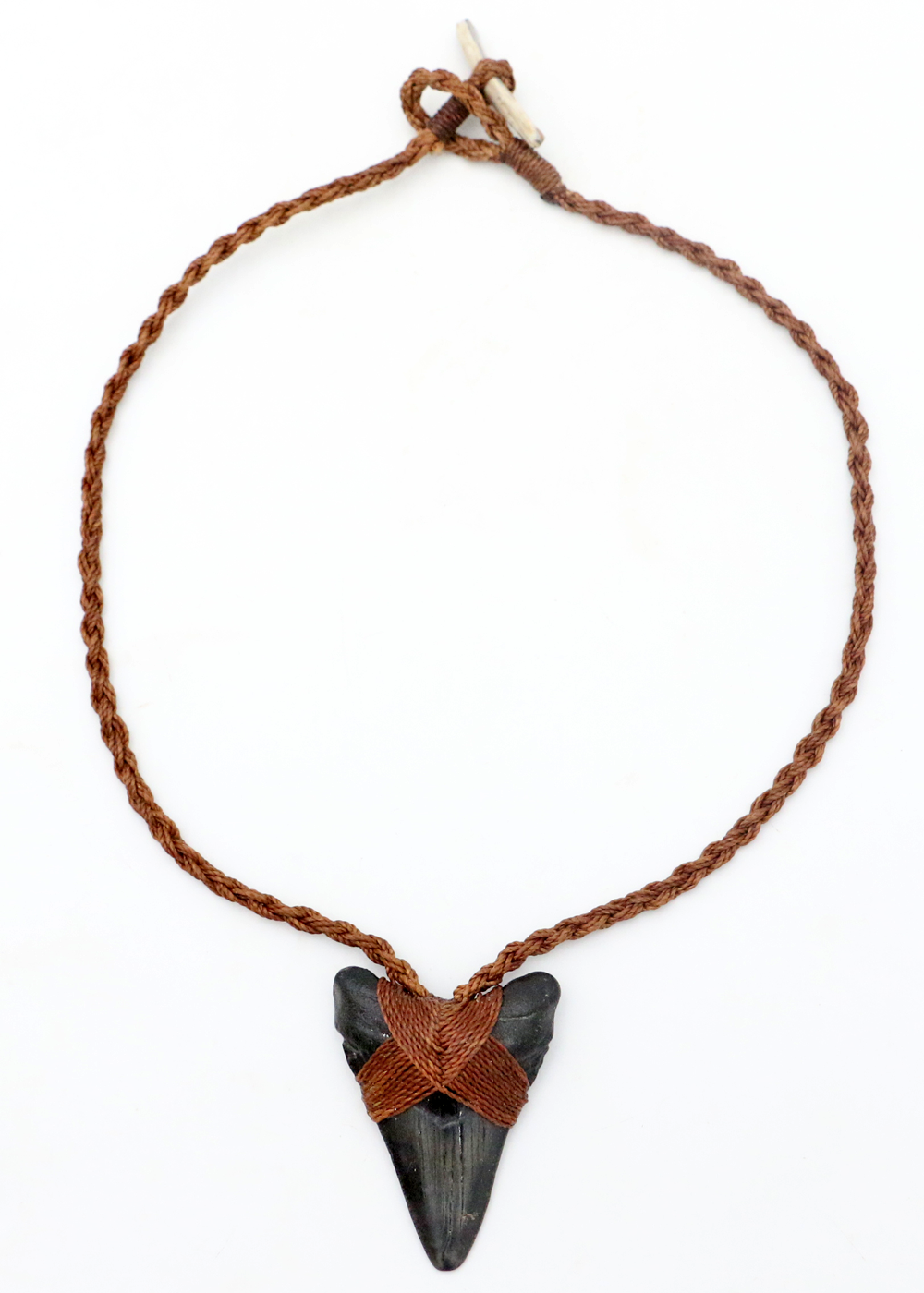 This pendant features a juvenile megalodon shark tooth lashed in traditional Māori style and paired with an ancient Ice Age bone clasp. It's a wearable piece of art. Megalodon teeth stand out for their impressive size and serrated edges—natural blades that once helped this colossal shark hunt whales. These fossils provide a rare glimpse into the power and evolution of Earth's largest shark, making this necklace a striking emblem of ancient strength and history.