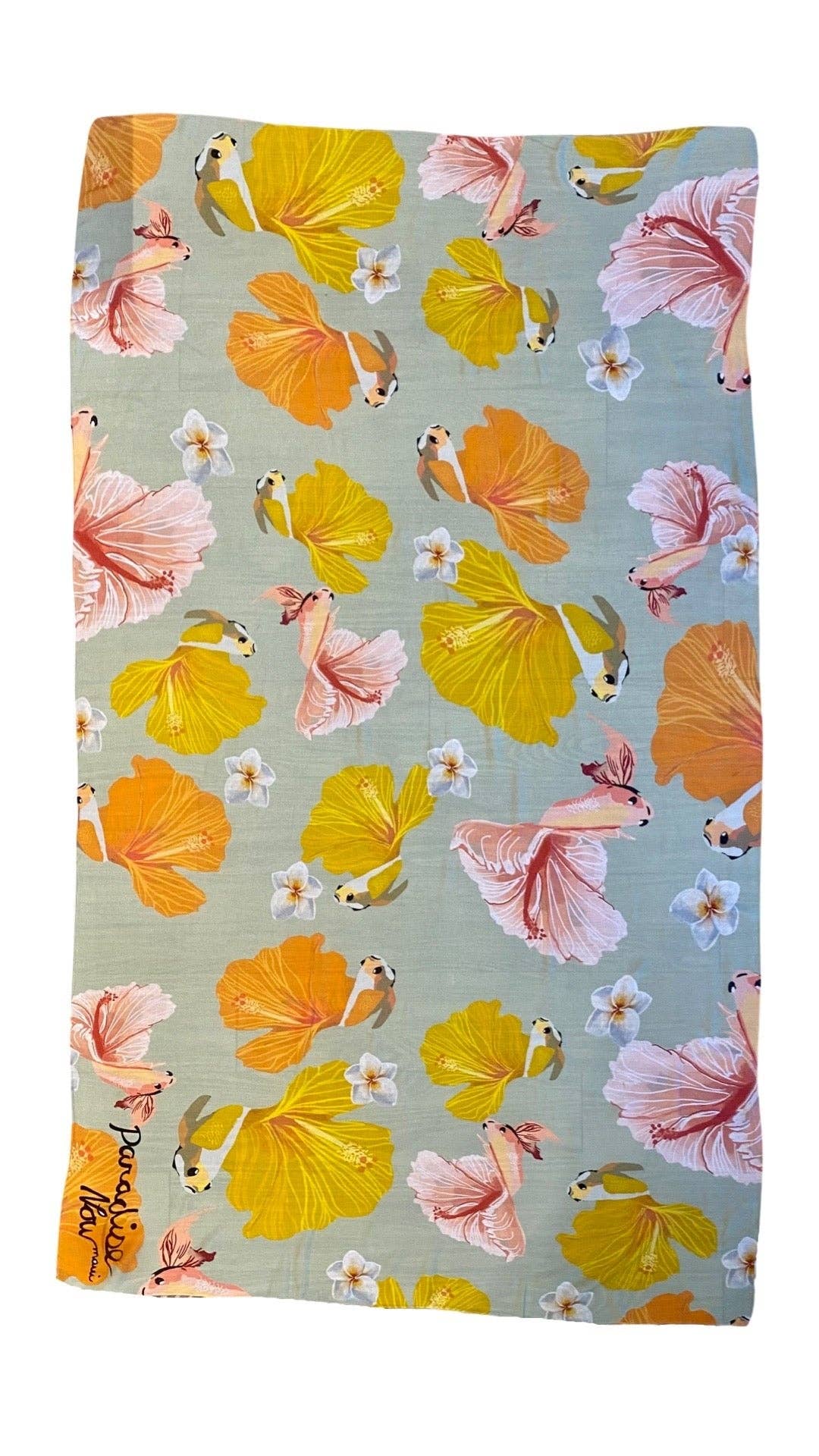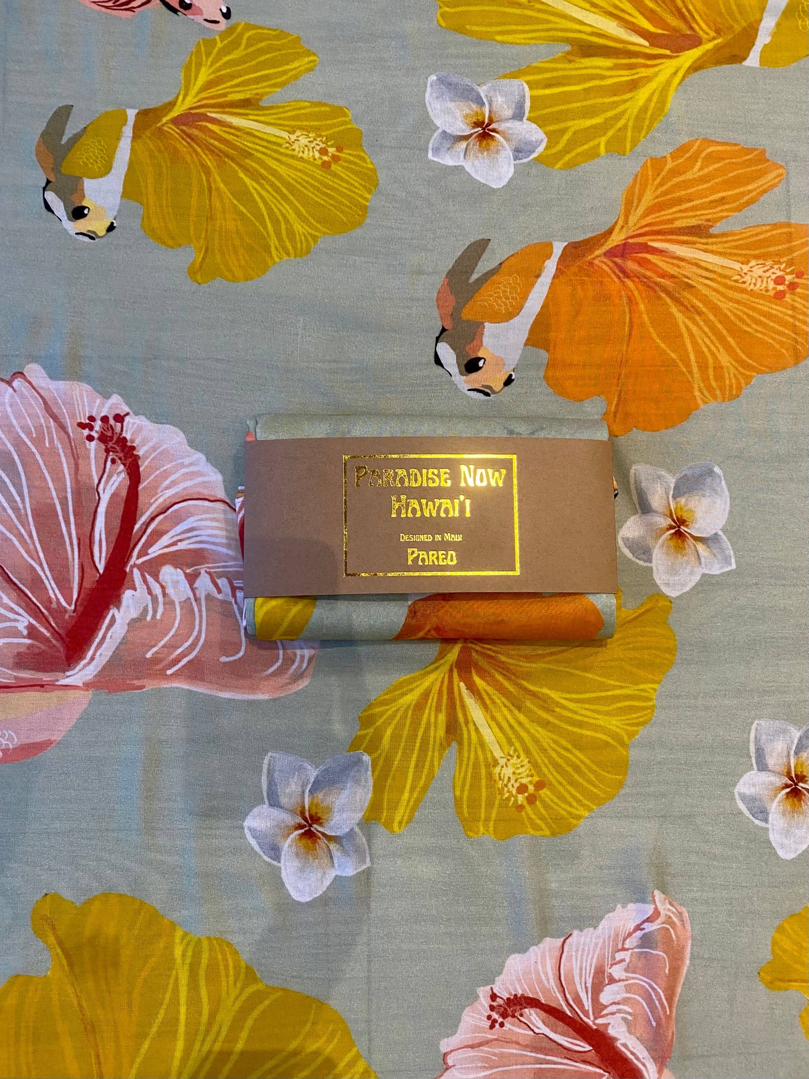 Crafted by designer Jaclynn Sabado-Eitel, this versatile pareo transforms your wardrobe and lifestyle. Wear it as a beach wrap, tie it into a skirt, drape it sarong-style, or spread it out as a lightweight cover-up—one piece, infinite possibilities. The captivating Koibiscus pattern features fusion of vibrant Koi fish and Hibiscus flower in golden yellows, coral oranges, and soft pinks dancing across a serene pearl grey base, bringing island elegance to every moment.