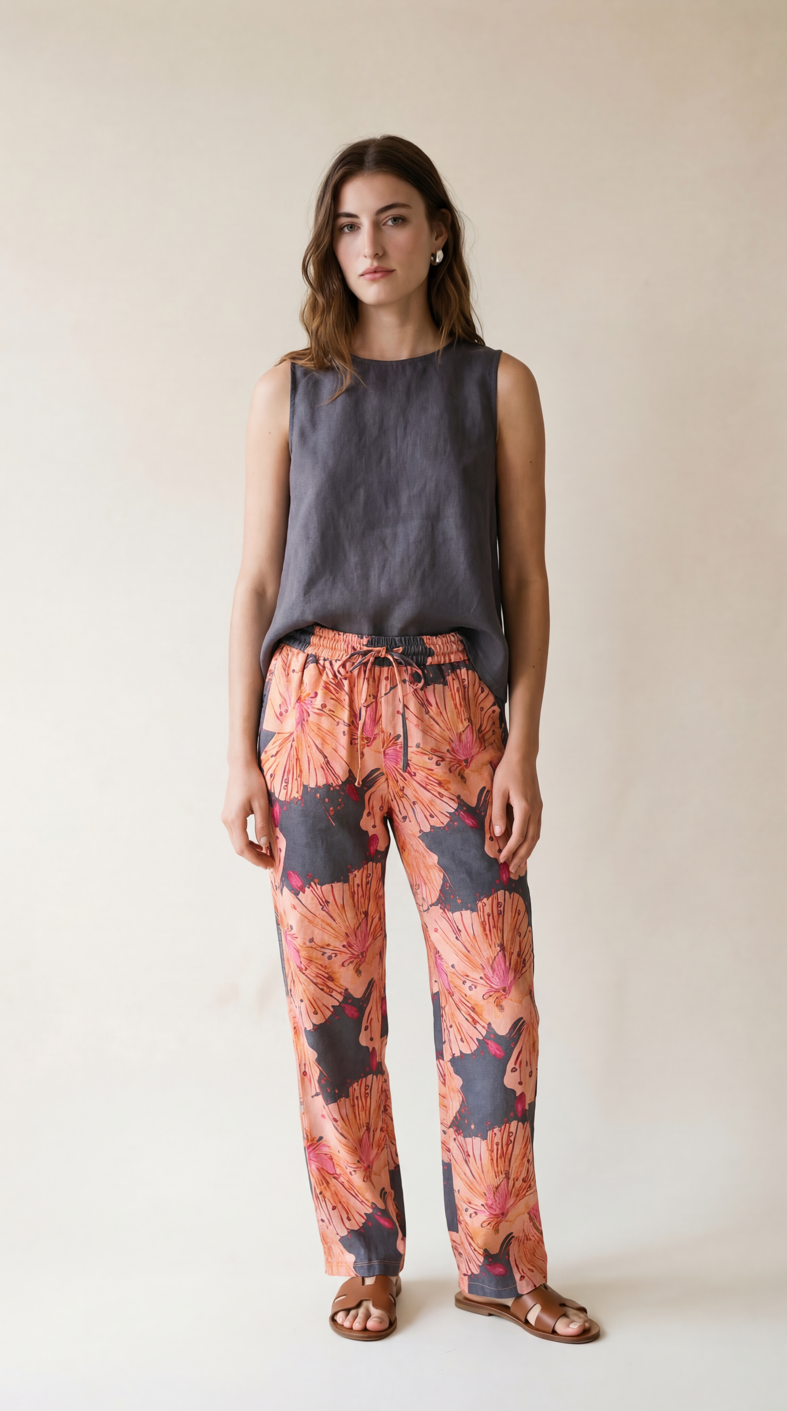 Indulge in the comfort and luxury of our top-quality linen blend. This sleeveless top, with its perfect fit and soft fabric, is ideal for lounging, resort cruising, and island life. With its flattering design and solid slate color, pairs well with many bottoms or you can complete the look with the matching abstract brown linen blend drawstring pant. The top is a must-have addition to your wardrobe.