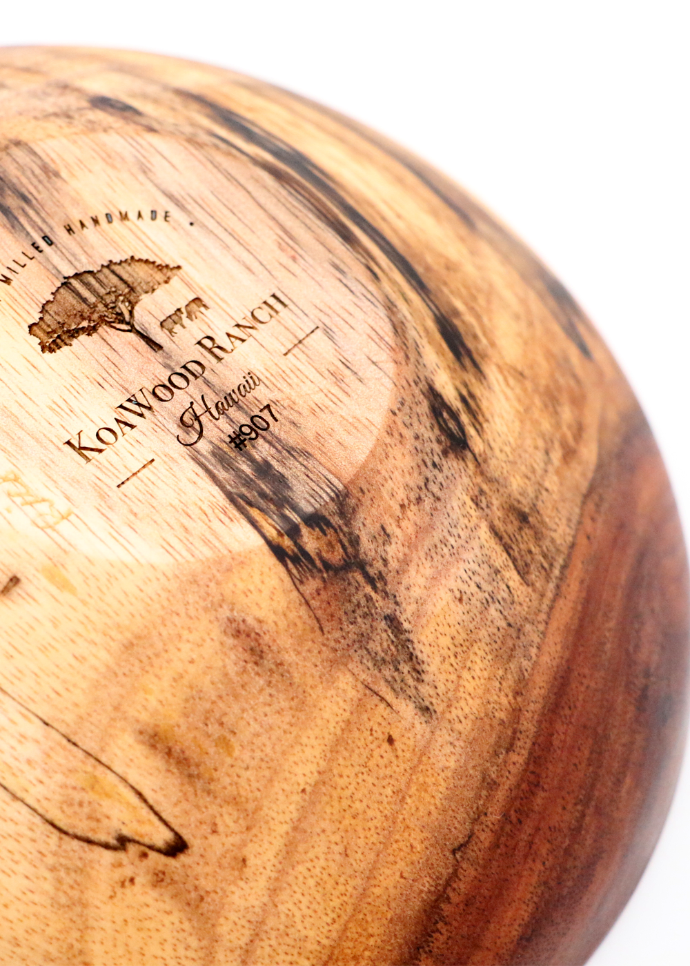 This is a Hawaiian Koa wood turned bowl, medium-sized, and numbered #1026. This piece stands at just about 2 1/4" high. This deep golden-brown Koa bowl reflects the unique and rich heritage of the Koa tree's characteristics. It has a beautiful hole and bark intrusion that is surrounded by wood grain curls. Harvested on the slopes of Mauna Kea and once reserved for only monarchs, this handcrafted Koa wood bowl will grace your home with the warmth Hawaiian wood art brings to any environment. This handmade heirloom is unique, branded, and numbered.