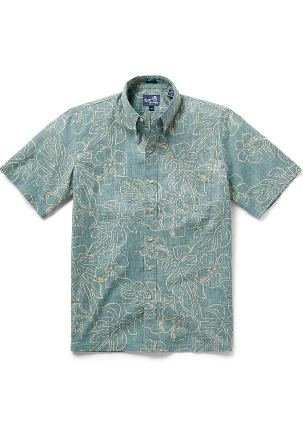 アーカイブプリント、2017年。この様式化された花には、2つの熱帯の美しい植物、幅広い熱帯の葉であるモンステラと、時代を超えたハワイの州花であるハイビスカスの2色スケッチの輪郭が描かれています。