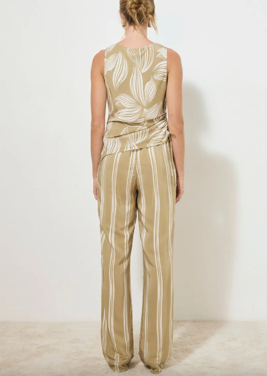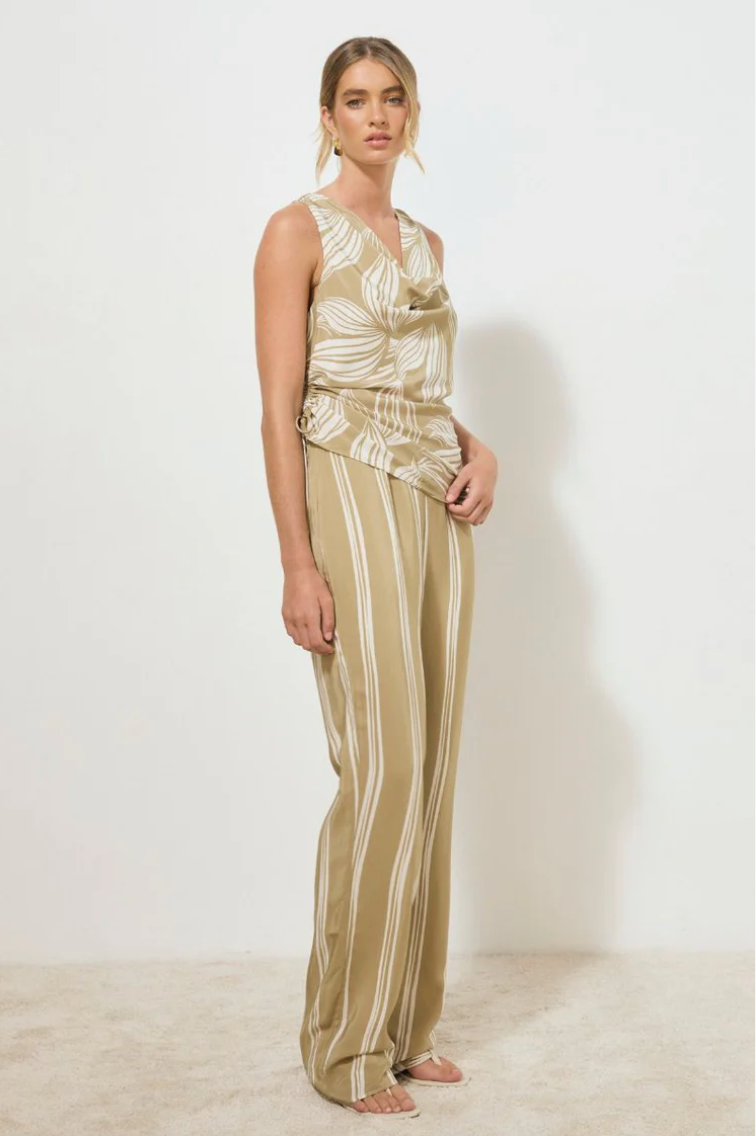 A sleeveless bias-cut top, crafted from a silky woven fabrication and adorned with an exclusive handcrafted print. Featuring a soft cowl neckline and relaxed fit, it is finished with a functional side drawcord that creates an asymmetrical hemline. Style with the Desire Stripe pants for an elevated everyday look.
