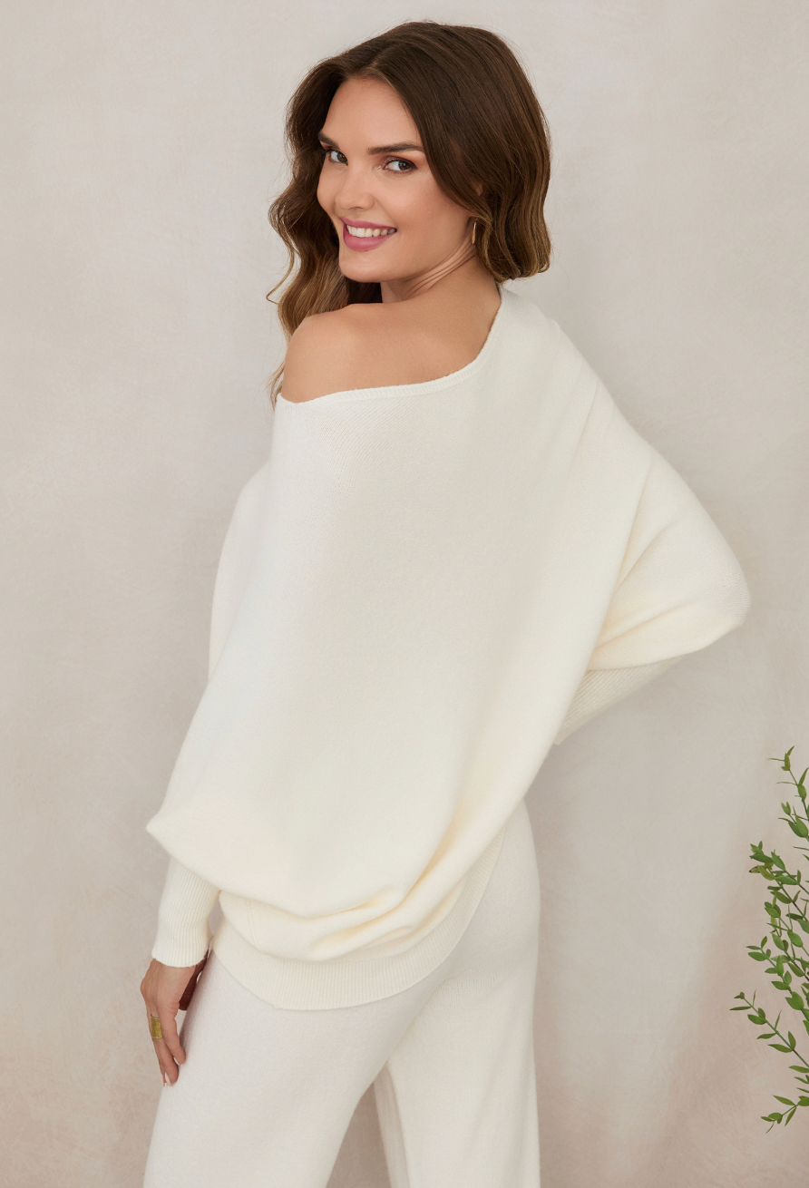 Effortlessly chic and undeniably comfortable, this asymmetrical knit top features a graceful boatneck that invites an off-the-shoulder moment. Dolman sleeves flow with ease while ribbed fitted cuffs anchor the silhouette, and the hip-length cut flatters every frame. Crafted from a luxuriously soft blend of viscose, polyester, and polyamide, it's the versatile piece your wardrobe has been waiting for—equally at home layered over basics or styled as a statement on its own.